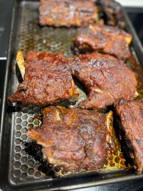 6. Grill and Serve: After roasting, remove ribs from parchment paper/foil and grill on high heat for 3-5 minutes per side until they have a nice char. Brush both sides with BBQ sauce while grilling, then cut into individual ribs. Arrange on a serving platter, brushing with more sauce as desired. Garnish with thinly sliced green onions for extra flavor. Enjoy!