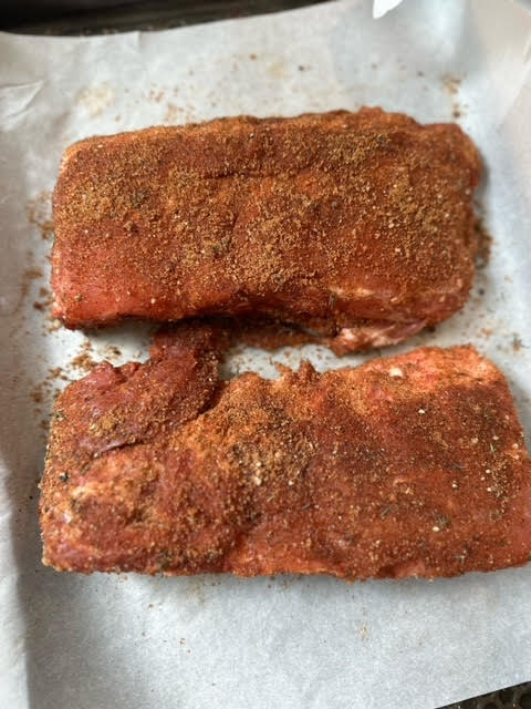 3. Wrap the Ribs: Lay two large pieces of parchment paper or if you prefer foil on a rimmed baking sheet, overlapping slightly at the seams. Repeat for the second rack on another baking sheet. Position the foil diagonally for the best fit. Place a rack of ribs on each sheet of parchment paper or foil, and rub the dry mix generously on both sides of the ribs.